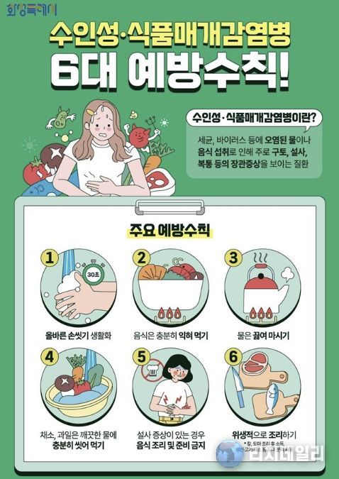 이에 시는 수인성·식품매개감염병 예방을 위한 6대 수칙을 적극 홍보하고 있다. 주요 내용은 ▲흐르는 물에 비누로 30초 이상 손 씻기 ▲음식은 중심부까지 충분히 익혀 먹기(육류 75℃, 어패류 85℃) ▲물은 끓여 마시기 ▲채소와 과일은 깨끗한 물에 씻어 먹기 ▲설사 증상 시 음식 조리 금지 ▲조리기구 용도 구분 등이다.