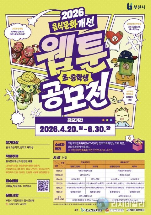 리치데일리 김상현 기자 | 부천시는 4월 20일부터 6월 30일까지 ‘2026년 음식문화개선 초중학생 웹툰·캐릭터 공모전’을 연다. 이번 공모전은 학생들이 일상 속 음식문화를 주제로 직접 창작에 참여함으로써 올바른 식문화에 대한 인식을 높이기 위해 매년 추진되고 있다.