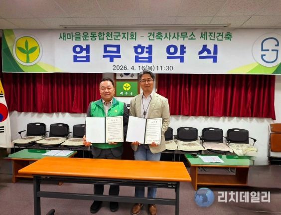 리치데일리 김상현 기자 | 새마을운동합천군지회(회장 정성철)와 건축사사무소 세진건축(대표 김세환)은 16일 새마을지회 회의실에서 군 및 읍·면 남녀 회장 40명이 참석한 가운데 업무협약식을 개최했다.