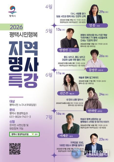 한편 모든 강좌는 4월 20일부터 평택시 평생학습 포털 및 전화로 사전 신청할 수 있으며, 일부 잔여 좌석에 한해 현장 참여도 가능하다. 평택시는 이번 지역 명사 특강을 통해 시민의 지식 성장을 지원하고, 열린 평생학습 문화 조성을 더욱 강화할 계획이다.