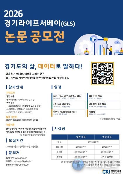 경기연구원은 이번 조사를 통해 확보한 대규모 데이터를 기반으로 데이터 중심의 과학적 행정을 뒷받침하고, 증거 기반 연구 역량을 한층 강화하는 데 주력할 방침이다. 연구 데이터의 지속가능성을 확보하고 창의적인 분석 아이디어를 통해 정책 활용도를 높이기 위해 ‘2026년 경기 라이프 서베이(GLS) 논문 공모전’을 개최할 예정이며, 이를 통해 도출된 제안과 분석 결과를 실질적인 정책 근거자료로 활용할 계획이다.
