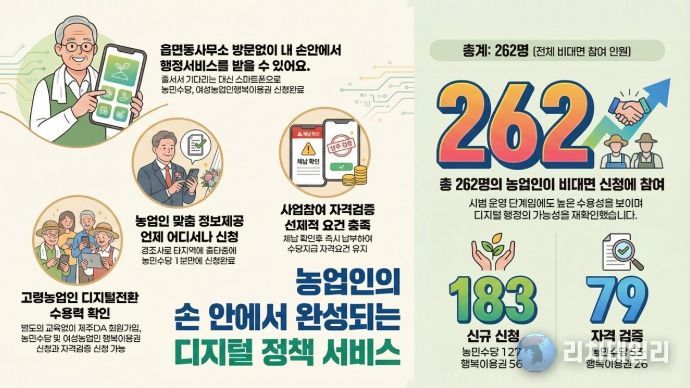 리치데일리 김상현 기자 | 제주특별자치도 농업기술원이 공공 마이데이터를 활용한 농업 정책수당 비대면 신청·검증 서비스를 시범 운영한 결과, 4.76점의 높은 만족도를 기록하며 농업 행정의 디지털 전환 가능성을 입증했다.