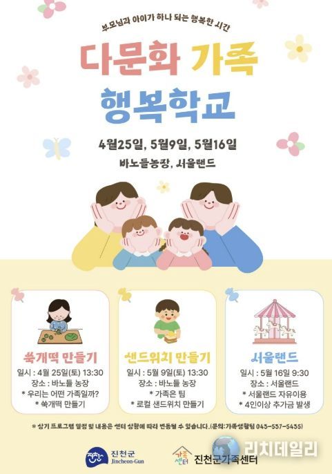 리치데일리 김상현 기자 | 충북 진천군가족센터는 진천군의 지원을 받아 다문화가족의 건강한 가족관계 형성과 정서적 유대 강화를 위한 ‘2026년 다문화가족 행복학교’를 운영한다고 밝혔다.