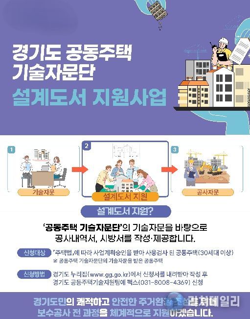한편 이번 설계도서 지원은 경기도가 아파트의 시공부터 유지보수까지 전 과정을 책임지는 ‘생애주기별 맞춤형 종합 지원서비스’의 하나다. 공사계획 단계에서 1단계 기술자문을 먼저 받은 단지라면 누구나 이 2단계 설계도서 지원을 신청할 수 있으며, 이후 3단계인 공사 품질 확보 자문까지 하나로 이어지는 혜택을 받을 수 있다. 지원을 희망하는 아파트 단지의 입주자대표회의는 경기도 누리집에서 신청서를 내려받아 작성한 뒤 경기도 공동주택기술지원팀에 팩스로 제출하면 된다.