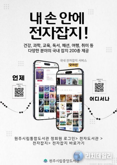 리치데일리 김상현 기자 | 원주시립중앙도서관은 디지털 시대에 발맞춰 국내 전자잡지 구독 서비스 ‘모아진’을 운영하고 있다.