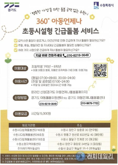 ‘초등시설형 긴급돌봄 서비스’는 갑자기 아동 돌봄이 필요할 때 요긴하다. 예상하지 못했던 출장이나 야근으로 퇴근이 예정보다 늦어지는 경우와 같은 돌발 상황에 모두 이용할 수 있다. 주말이나 휴일, 자정까지의 야간 시간 등은 물론 등교 전인 오전 7시부터 서비스를 제공한다. 장안구 2곳(연무동, 파장동), 권선구 1곳(호매실동), 팔달구 1곳(매교동), 영통구 1곳(매탄동) 등 총 5개 돌봄 기관에서 최대 8시간을 맡아준다. 경기도 아동언제나돌봄 홈페이지에서 온라인 신청할 수 있고, 경기도아동돌봄수원센터에 전화 신청할 수도 있다. 이용요금은 시간당 5천원이다.