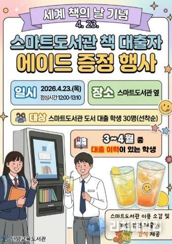 이번 행사에서는 3~4월 중 스마트도서관에서 책을 대출한 학생 선착순 30명을 대상으로 시원한 에이드 음료를 제공한다.