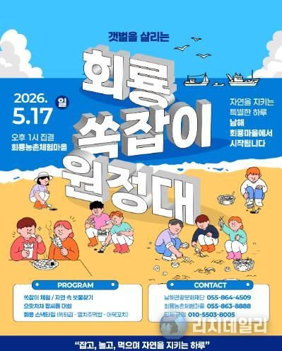 리치데일리 김상현 기자 | 남해관광문화재단은 ‘2026 지역민 주도 소규모 축제 개최 지원 사업’의 일환으로 오는 5월 17일 일요일 오후 1시 ‘갯벌을 살리는 회룡 쏙잡이 원정대’ 축제를 개최한다.