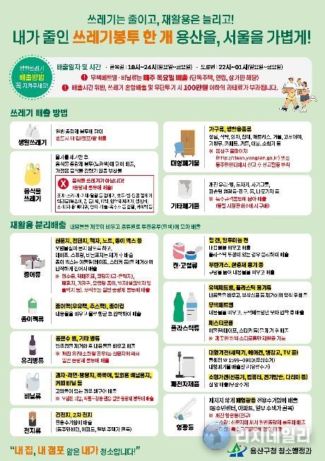 리치데일리 김상현 기자 | 서울 용산구가 주민 누구나 생활쓰레기 분리배출 정보를 쉽게 이해하고 실천할 수 있도록 주요 배출 정보를 한 장에 담은 안내문을 제작·배포한다.
