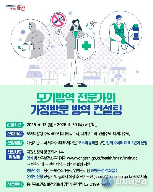 리치데일리 김상현 기자 | 서울 용산구가 다가오는 여름철 모기 매개 감염병 예방과 주민들의 쾌적한 주거 환경 조성을 위해 ‘모기방역 전문가 가정방문 컨설팅’을 500가구로 대폭 확대 추진한다.