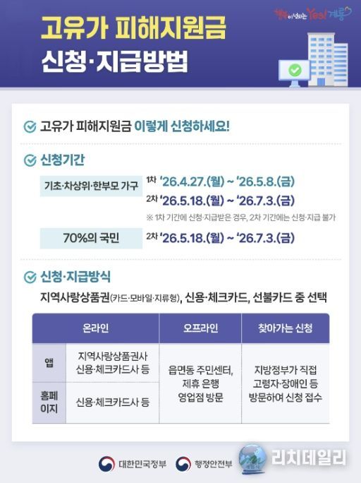 리치데일리 김상현 기자 | 충남 계룡시는 최근 중동지역 전쟁 등으로 인한 고유가·고물가 상황 속에서 시민들의 경제적 부담을 완화하기 위해 ‘고유가 피해지원금’ 지원사업을 본격 추진한다고 밝혔다.