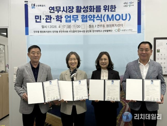 리치데일리 김상현 기자 | 수원시 장안구 연무동 행정복지센터와 주민자치회, 반딧불이연무시장상인회, 경기대학교 산학협력단은 지난 17일, 각 기관의 긴밀한 상호 협력과 유대관계 강화를 위한 업무협약을 체결했다.