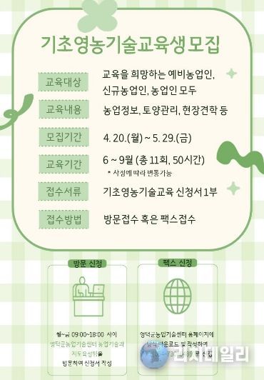 모집 기간은 다음 달 29일까지이며, 교육 신청을 희망하는 교육생들은 영덕군농업기술센터 농업기술과 지도육성팀을 방문하거나 팩스로 접수할 수 있다.