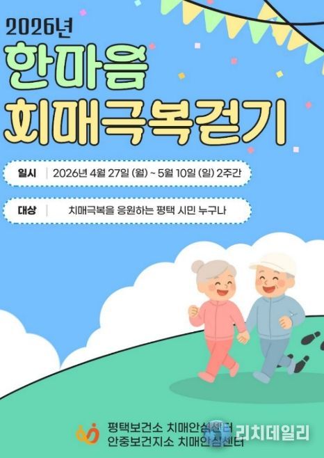 리치데일리 김상현 기자 | 평택보건소 치매안심센터와 안중보건지소 치매안심센터에서는 지역 주민의 치매 예방과 인식개선을 위해 녪년 한마음 치매극복 걷기 행사’를 오는 4월 27일부터 5월 10일까지 2주간 진행한다.