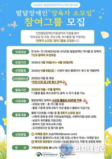 리치데일리 김상현 기자 | 인천시사회서비스원 소속 인천장애인종합복지관은 ‘발달장애인 양육자 소모임’ 참여자를 모집한다고 21일 밝혔다.