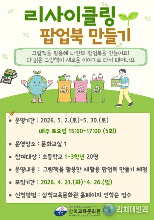 장병진 삼척교육문화관장은 “기존 그림책을 재활용해 팝업북으로 다시 구성하는 활동을 통해 어린이들이 책을 새롭게 바라보고 창의적으로 표현하는 즐거움을 느끼는 한편, 자원 순환의 가치도 자연스럽게 체득하길 바란다”라고 말했다.