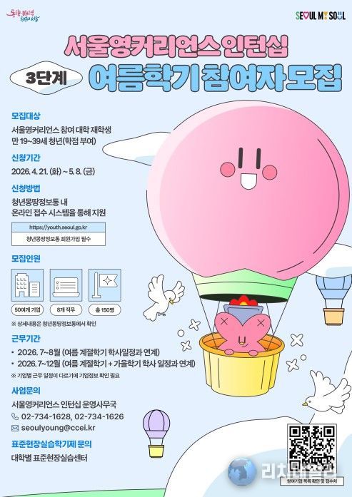 리치데일리 김상현 기자 | 서울시가 국내 최초로 도입한 초기 청년 대상 단계별 취업 지원책인 ‘서울영커리언스 사업’의 3단계, 인턴십의 여름학기 참여자 150명을 모집한다고 밝혔다.