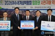 리치데일리 김상현 기자 | (재)2026여수세계섬박람회조직위원회는 4월 2일 전남도청 VIP실에서 탑솔라㈜와 ‘2026여수세계섬박람회 입장권 구매약정식’을 개최했다고 밝혔다. 이날 약정식에는 유병진 탑솔라㈜ 대표이사, 황기연 전라남도지사 권한대행과 정현구 여수시장 권한대행, 김종기 조직위 사무총장 등이 참석했으며, 탑솔라㈜는 2천만 원 상당의 입장권을 구매하기로 약정했다. 전남에 본점을 둔 탑솔라㈜는 태양광 발전 사업을 기반으로 신재생에너지 분야에서 성장하고 있는 기업으로, 친환경 에너지 확산과 지역사회 발전에 기여하고 있다. 현재 전남개발공사와 공동으로 무안군·영광군에 BESS 160MW를 추진 중이며, 태양광발전 누적 시공용량 1.6GW, 에너지저장장치 1.1GWh 시공 등 대한민국 대표 신재생 에너지기업으로 자리매김했다. 유병진 대표이사는 “2026여수세계섬박람회가 성공적으로 개최되기를 바라는 마음으로 이번 약정에 참여하게 됐다”며 “앞으로도 지역사회와 상생하며 박람회 성공을 위해 지속적인 관심과 지원을 이어가겠다”고 말했다. 김종기 사무총장은 “기업의 참여는 박람회 성공 개최를