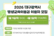리치데일리 김상현 기자 | 대구광역시는 교육 격차를 해소하고 시민들의 역량 개발과 자아실현을 돕기 위해 3월 19일부터 ‘2026년 대구광역시 평생교육이용권’ 1차 이용자 모집을 시작한다. 평생교육이용권은 사회·경제적 여건 등으로 평생학습 참여가 어려운 시민에게 수강료와 교재비 등을 지원하는 제도다. 대구시는 지난해 4,800여 명의 시민에게 자격증 취득, 직업능력 개발, 디지털 역량 강화 등 다양한 학습 기회를 제공했다. 올해 지원 규모는 약 5,000명으로, 두 차례에 나눠 모집한다. 1차 모집은 3월 19일부터 4월 2일까지 저소득층과 노인 등을 대상으로 진행된다. 이용권별 신청 대상은 ▲일반 이용권은 19세 이상 기초생활수급자 및 차상위계층 등 ▲AI·디지털 이용권은 30세 이상 시민 ▲노인 이용권은 65세 이상 시민이다. 2차 모집인 장애인 평생학습 참여 확대를 위한 ‘장애인 평생교육이용권’은 4월 14일부터 4월 27일까지 별도로 접수할 예정이다. 이용권 신청은 평생교육이용권 누리집을 통해 온라인으로 신청하면 된다. 자세한 사항은 대구시 평생교육