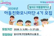 리치데일리 김상현 기자 | 대구 달서구는 아동 정책에 대한 의견을 제시하고 아동권리 증진 활동에 참여할‘아동친화모니터단 4기’단원을 오는 27일까지 모집한다. 달서구 아동친화모니터단은 아동이 행복한‘아동친화도시 달서구’조성을 위한 아동참여기구로, 달서구에 주민등록을 둔 만 7세 이상 18세 미만의 초·중·고등학생 및 학교밖청소년이면 누구나 신청할 수 있다. 모집 인원은 30명 내외다. 공개모집 또는 기관 추천을 통해 선발된 단원들은 4월 위촉식을 시작으로 2년간 활동하며 ▲ 아동친화도시 조성을 위한 정책 제언, ▲ 아동권리 교육 및 캠페인 참여, ▲ 아동권리 모니터링 등 다양한 활동에 참여하게 된다. 달서구는 지난 2020년 1기 출범 이후 아동친화모니터단을 운영하며 아동이 지역사회 정책에 참여하고 아동 권리 증진 활동에 직접 참여할 수 있는 기회를 지속적으로 확대해 왔다. 참여를 희망하는 아동·청소년은 신청서를 작성해 달서구청 아동친화과로 방문 접수하거나 이메일로 제출하면 된다. 신청서 서식은 달서구청 홈페이지 또는 모집 포스터의 QR코드를 통해 내려받을 수 있다. 이태훈