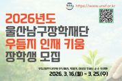 리치데일리 김상현 기자 | (재)울산광역시남구장학재단은 재능과 잠재력을 가진 청소년을 발굴해 남구를 대표하는 인재로 성장시키기 위한 ‘2026년 우듬지 인재 키움 사업’ 장학생을 모집한다. ‘우듬지’는 나무의 꼭대기 줄기이자 정상을 의미하는 순우리말로 남구의 미래를 이끌 최고 인재로 성장하길 바라는 의미를 담아 지난해 처음 시행한 남구장학재단의 대표 인재 육성 사업이다. 장학금 지원뿐만 아니라 봉사활동, 재능기부, 멘토링 등 지역사회 환원 활동을 통해 지역 인재의 성장과 나눔이 이어지는 선순환 구조를 만들어 가는 것을 목표로 하고 있다. 2025년에는 수학·과학 등 미래 분야와 음악·미술·체육 등 예체능 분야에서 15명의 장학생을 선발해 지원했고 올해는 기존 장학생 지원을 이어가면서 신규 장학생 17명을 추가 선발해 총 30명의 지역 인재에게 장학금을 지원할 계획이다. 선발 분야는 미래리더(수학·과학)와 예체능리더(음악·미술·체육)로 재능과 성장 가능성을 갖춘 중·고등학생, 대학생, 학교 밖 청소년을 대상으로 선발한다. 지원자는 공고일 기준 울산 남구에 1년 이상 거주하고 남구 소재