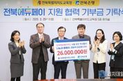 리치데일리 김상현 기자 | 전북에듀페이카드 운영사인 전북은행이 전북특별자치도교육청에 장학금 2,600만 원을 기부했다. 전북교육청과 전북은행은 25일 본청 5층 회의실에서 전북에듀페이 지원 협력사업 기부금 기탁식을 개최했다. 전북은행은 이날 전북에듀페이카드 바우처 사용액의 0.1%에 해당하는 2,600만 원의 기부금을 학생 복지와 지역사회 공헌의 취지로 기탁했다. 지난해 2,000만 원을 기부한 전북은행은 내년까지 3년 동안 약 6,300만 원을 기부할 계획이다. 전북은행 기부금은 전북특별자치도교육청사랑의장학회를 통해 장학금으로 전달된다. 올해 초중고 학생과 학교 밖 청소년 등 총 16만3,000여 명에게 238억여 원의 전북에듀페이를 지원하기로 한 전북교육청은 이달 24일부터 다음 달 15일까지 집중신청 기간을 운영하고 있다. 김은호 전북은행 부행장은 “전북에듀페이카드 운영사로서 전북에듀페이를 매개로 나눔과 베풂의 학생 교육복지에 동참할 수 있어 뜻깊게 생각한다”고 밝혔다. 한긍수 정책국장은 “전북에듀페이가 단순한 지원금을 넘어 교육과 나눔이 공존하는 선순환